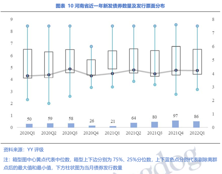 從發行情況來看,河南省近一年新發債券數量及發行票面利率如下圖所示,22年一季度月發行債券86只,發行額545.23億;整體看全省新發債券票面利率自21Q1以來波動上升,22Q1中位數為4.76%。