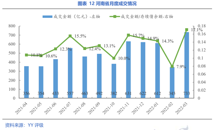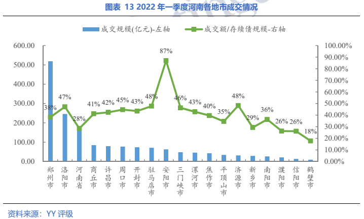分地級市來看,成交規模方面,排序與存續債體量有一定相關性;從成交金額/存續債余額來看,安陽、駐馬店、濟源和洛陽的成交更為活躍,另外,鶴壁的成交活躍度最低。