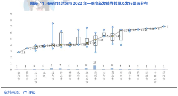 地市級層面,南陽、信陽和三門峽市一季度票面中位數低,分別為2.80%、3.36%和3.79%(但樣本過少或不具備統計學意義);漯河市整體票面最高,中位數達到7%;發債數量最多的鄭州市,一季度票面中位數在4.35%左右。