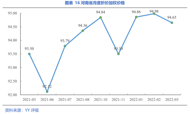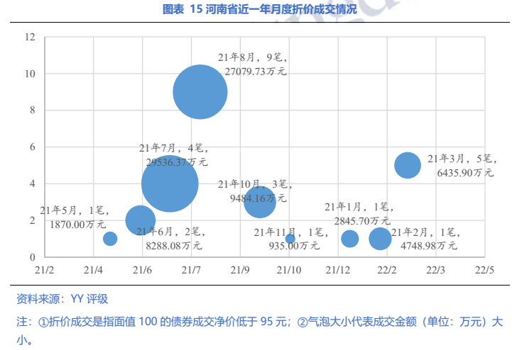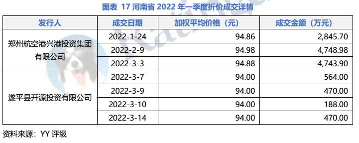 具體到主體,22年一季度河南省發生折價成交的平臺包括鄭州航空港興港投資集團有限公司(YY5-)和遂平縣開源投資有限公司(YY8),分別為鄭州市和駐馬店市的平臺。河南省近一年的折價成交主要發生在鄭州航空港興港投資集團中。