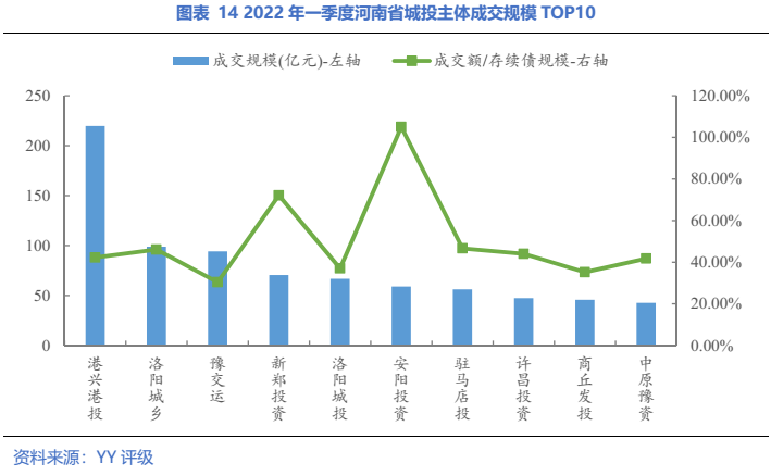 具體到主體層面,2022年一季度成交規模最大的主體是港興港投;從成交金額/存續債余額來看,成交額前10的主體中,安陽投資的成交最為活躍,豫交運的成交活躍度最低。