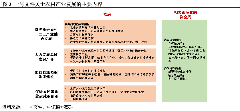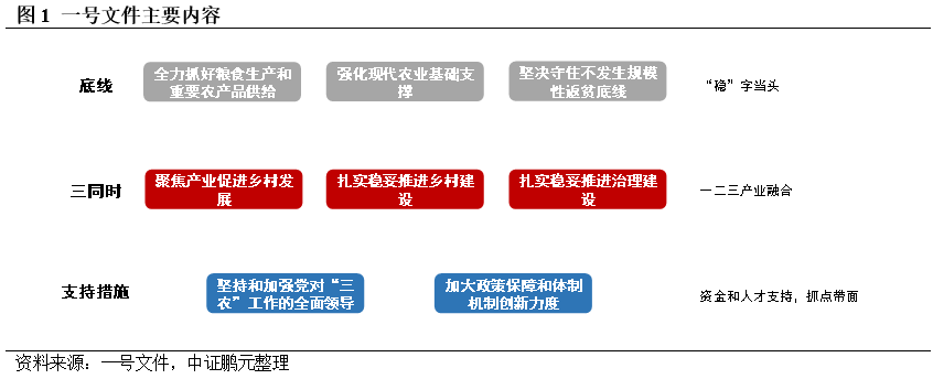 一號文件:一號文件指出,鄉村振興要守住保障國家糧食安全和不發生規模性返貧兩條底線,文件共分8個部分,其中,(1)第1-3章,主要說明政策基調“穩”字當頭,包括全力抓好糧食生產和重要農產品供給,強化現代農業基礎支撐,堅決守住不發生規模性返貧底。其中,“不發生規模性返貧”是扶貧攻堅轉向鄉村振興的重要環節,為鄉村振興工作構建扎實基礎。(2)第4-6章,具體介紹了鄉村振興的三個領域,包括鄉村發展、鄉村建設和鄉村治理,其核心為“促進一二三產業融合”,以二三產業促進農業實現轉型升級,同時形成產業效應,發展經濟、帶動就業,同時推進鄉村基礎設施改造升級,推進數字鄉村、綠色鄉村、和諧鄉村的建設。(3)第7-8章,明確政策支持措施,包括擴大鄉村振興財政資金投入、強化鄉村振興金融服務和人才隊伍建設,以及積極推動農村經濟發展新模式的探索。