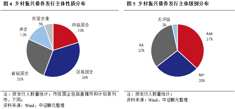 從發行主體性質看,鄉村振興債券參與者主要是國有企業,其中,區縣國企占比36%,為主要發行人類型,其次是省級國企,占比26%,市級國企占比20%。從發行主體級別看,AAA級占比37%,以省級國企和央企為主;AA級占比32%,以區縣國企為主;AA+級占比28%,以市級和區縣國企為主。