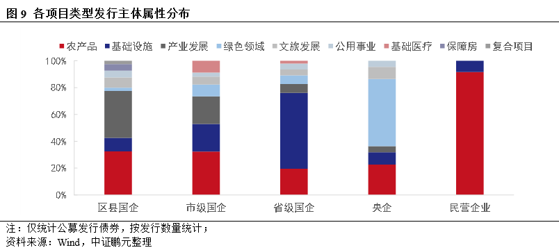 結合企業屬性來看:第一,區縣國企。主要承擔產業園區建設、農貿市場以及公用事業項目。此類項目,建設難度相對較低,但對運營的要求較高,需要關注運營期的預期收入情況。第二,市級國企。主要承接農產品收儲,其次,是公路建設和產業園區,其中公路建設以償還相關債務為主。第三,省級國企。主要負責高速公路建設,其次是農產品收儲。第四,央企。主要承接綠色領域項目,主要包括太陽能、風力發電等新能源項目,其次是農產品收儲、流通,主要是農業產業化龍頭企業,例如,中糧集團、蒙牛等。第五,民營企業,主要是農業產業化龍頭企業,例如,新希望、金龍魚、伊利,以及德邦,募集資金用于農產品收購和物流建設。