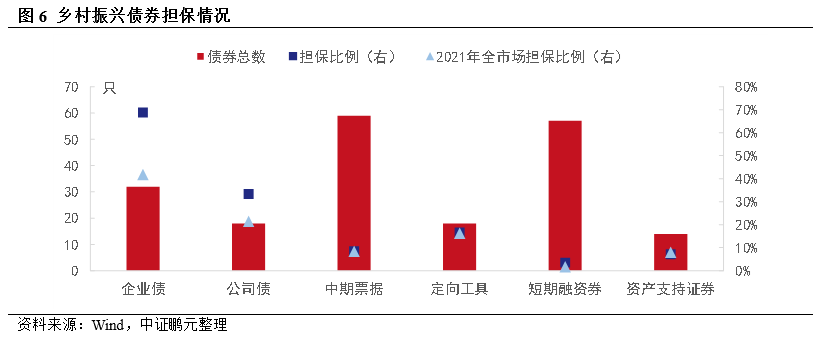 鄉村振興債券的擔保比例相對來說高于全市場平均水平,其中,有擔保債券39只,占比19.7%。分債券類型看,企業債和公司債的擔保比例明顯高于市場平均水平。