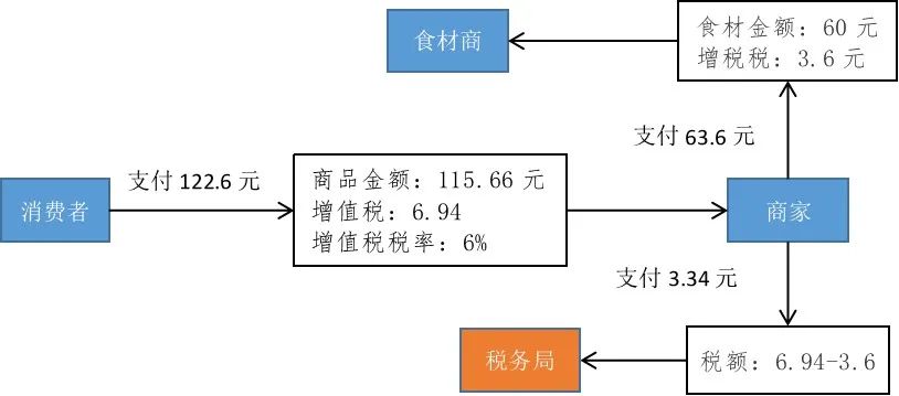以日常生活中的餐飲為例,在消費(fèi)結(jié)束后開具增值稅發(fā)票,發(fā)票金額中經(jīng)常會(huì)出現(xiàn)三個(gè)金額,如下圖所示,作為消費(fèi)者最終要支付的金額為122.6元。但通過(guò)發(fā)票可以看出,其組成結(jié)構(gòu)為兩部分:即115.66元+6.94元。115.6元是餐飲服務(wù)實(shí)際發(fā)生的金額;6.94元是伴隨這項(xiàng)消費(fèi)產(chǎn)生的增值稅。
