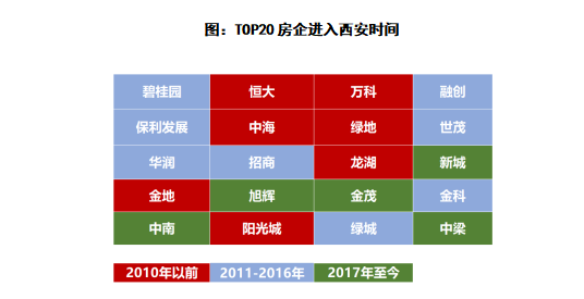 大型的品牌開發商在21世紀初便已紛紛進駐西安布局。其中中海地產于2003年成立西安公司進入西安,到2019年1月隨著中梁控股借道綠城一起合作開發西安西咸新區世紀大道項目,20強房企實現全部布局西安。此外,品牌房企中富力、雅居樂、金輝、融僑等也在早年進入了西安,據統計截止2020年底,TOP50房企中,有超過80%的企業落子西安。