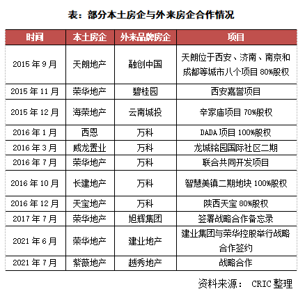 在省內項目打造上,特別是西安項目的開發上,陜西本土房企早期多數利用良好的政商關系與政府進行合作,利用自有優勢拿地,擁有較大的土地資源優勢,不過2011年后隨著市場下行,而多數房企在西安內主要涉足舊改項目,資金沉淀較大,企業開發壓力也較大。到2015年9月天朗將8個項目的80%股權以6.84億元賣給融創之后,開啟了本土房企與外來房企的合作開發項目的模式先河,本土房企擁有豐富的土儲以及客研經驗,而外來品牌房企擁有充足的資金以及先進的開發及管理經驗,兩者一拍即合,簽署戰略合作協議共同開發項目。