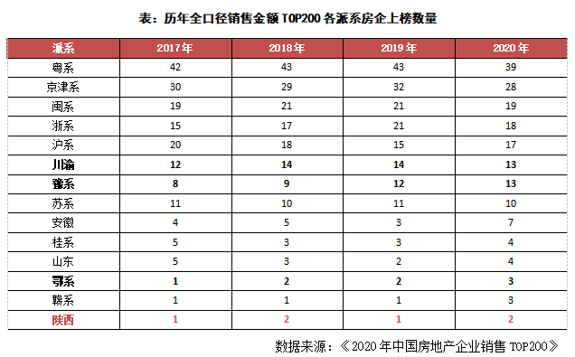 從陜西房企的發展情況來看,規模陜西房企數量較少,自2017年以來,僅有3家陜西房企在克而瑞《2020年中國房地產企業銷售TOP200排行榜》全口徑銷售金額榜單中出現,分別是龍記泰信、天地源以及天朗地產。從上榜房企數量來看,陜西房企上榜數量較少,2017-2020年間每年最多2家企業上榜,明顯低于周邊川渝、豫系、鄂系等區域房企個數。
