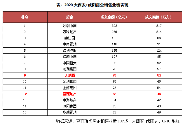 根據克而瑞西安機構的數據來看,2020年大西安+咸陽房企銷售表現中,融創以303億元摘得榜首,萬科、碧桂園緊隨其后,在TOP15排行榜中,本土房企天地源和紫薇地產分別以76億元和65億元分別排名第9和第12名,整體來看,本土房企僅有2家高科系的身影,未來在強者恒強的情況下,西安本土小房企的擴張之路將更加困難。