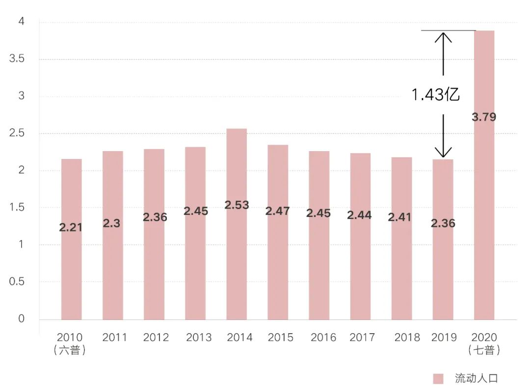 由于經濟的快速發展、交通的日益便捷以及落戶門檻的逐漸降低,城市之間的空間距離被明顯拉近,流動人口的規模也在明顯提升。數據顯示,2020年人戶分離人口為49276萬人,其中,流動人口為37582萬人,與2010年相比,流動人口增長69.73%。同時這一數據也遠超2018年《中國流動人口發展報告》中2.4億流動人口的總規模,也顛覆了近5年流動人口發展報告中流動人口規模持續下滑的觀點,流動人口規模還在持續上升。