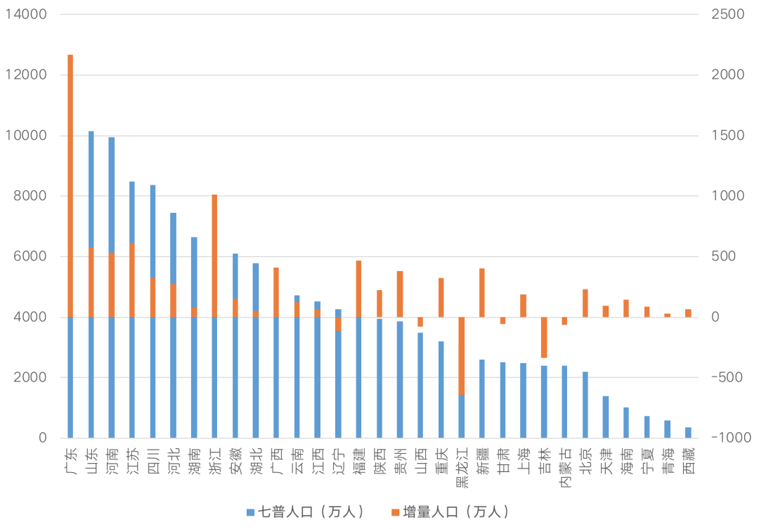 對比2010年,共有25個省份的人口增加。增長較多的 5個省份依次為:廣東(2171萬人)、浙江(1014萬人)、江蘇(609萬人)、山東(573萬人)、河南(534萬人)。