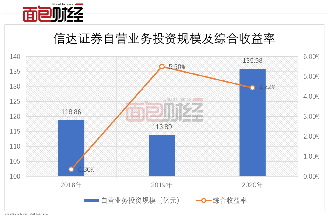 從具體業(yè)務(wù)來(lái)看,母公司口徑下,公司證券自營(yíng)業(yè)務(wù)的投資規(guī)模整體增長(zhǎng),由2018年的118.86億元增長(zhǎng)至2020年135.98億元,但綜合收益率波動(dòng)較大,2018年至2020年分別為0.36%、5.50%和4.44%。