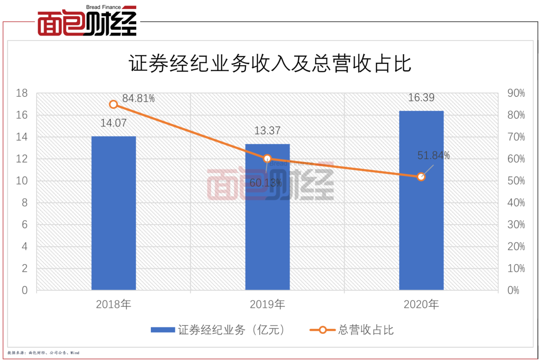 從收入構(gòu)成來(lái)看,公司主要以證券經(jīng)紀(jì)業(yè)務(wù)為主,2020年該業(yè)務(wù)實(shí)現(xiàn)營(yíng)收16.39億元,在總營(yíng)收中的占比超過(guò)50%。但值得注意的是,近三年該業(yè)務(wù)的營(yíng)收占比持續(xù)下降,由2018年的84.81%下降至2019年的60.13%,2020年占比再次下降至51.84%。