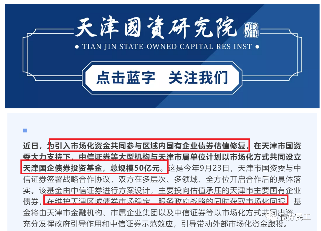 根據(jù)天津市國資委的微信公眾號,天津市設(shè)立了50億元的國企債券投資基金,用于維護(hù)天津區(qū)域債券市場穩(wěn)定,修復(fù)國有企業(yè)債券估值。