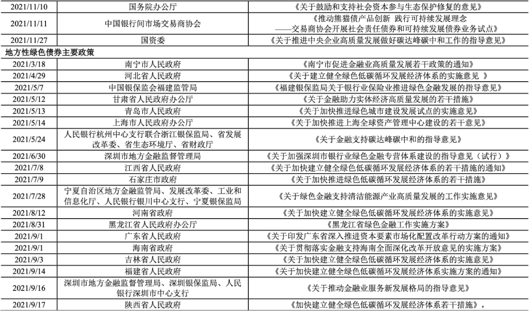 鼓勵地方綠色債券投資。2021年5月7日,福建銀保監(jiān)局出臺《關(guān)于銀行業(yè)保險業(yè)推進(jìn)綠色金融發(fā)展的指導(dǎo)意見》,指出支持各銀行業(yè)機(jī)構(gòu)發(fā)行以綠色信貸資產(chǎn)為基礎(chǔ)資產(chǎn)的證券化產(chǎn)品,改善資產(chǎn)負(fù)債結(jié)構(gòu);支持保險機(jī)構(gòu)通過股權(quán)、債權(quán)等方式,為重點(diǎn)綠色項(xiàng)目提供長期、穩(wěn)定的資金支持;鼓勵有條件的機(jī)構(gòu)發(fā)行綠色金融債券;支持信托公司多元化拓展綠色信托業(yè)務(wù),積極受托發(fā)行綠色信貸資產(chǎn)證券化、綠色企業(yè)資產(chǎn)支持票據(jù),承銷、投資綠色債券。2021年5月10日,廣東省政府印發(fā)《廣東省促進(jìn)建筑業(yè)高質(zhì)量發(fā)展若干措施的通知》,指出大力發(fā)展綠色金融,向節(jié)能建筑、綠色建筑以及以智能建造和新型建筑工業(yè)化方式建設(shè)項(xiàng)目提供綠色信貸、綠色債券等融資對接服務(wù),鼓勵保險資金支持相關(guān)項(xiàng)目建設(shè)或者提供增信措施。2021年5月14日,上海市政府發(fā)布《關(guān)于加快推進(jìn)上海全球資產(chǎn)管理中心建設(shè)的若干意見》,指出擴(kuò)大綠色債券發(fā)行規(guī)模,推動綠色信貸資產(chǎn)、節(jié)能減排項(xiàng)目應(yīng)收賬款等證券化,引導(dǎo)資產(chǎn)管理機(jī)構(gòu)配置綠色資產(chǎn);發(fā)展綠色債券指數(shù)以及相關(guān)投資產(chǎn)品。2021年7月28日,寧夏金融監(jiān)管局等多部門聯(lián)合印發(fā)《關(guān)于綠色金融支持清潔能源產(chǎn)業(yè)高質(zhì)量發(fā)展的工作實(shí)施意見》,指出圍繞全產(chǎn)業(yè)鏈發(fā)展綠色金融,鼓勵各類金融機(jī)構(gòu)通過綠色債券等多種金融工具拓寬企業(yè)融資渠道;積極引導(dǎo)險資直投,發(fā)揮綜合金融服務(wù)集團(tuán)和保險資金長期配置優(yōu)勢,通過債券等形式參與綠色項(xiàng)目投資建設(shè)。2021年9月1日,海南省政府發(fā)布《關(guān)于貫徹落實(shí)金融支持海南全面深化改革開放意見的實(shí)施方案》,指出支持銀行業(yè)金融機(jī)構(gòu)發(fā)行綠色金融債券,支持符合條件的綠色企業(yè)上市融資、再融資、發(fā)行綠色債券等;建立金融機(jī)構(gòu)投資綠色債券、綠色產(chǎn)業(yè)的激勵機(jī)制,提高金融機(jī)構(gòu)參與海南綠色投融資項(xiàng)目的積極性。此外,為落實(shí)《銀行業(yè)金融機(jī)構(gòu)綠色金融評價方案》,2021年12月,央行杭州中心支行和上海分行相繼印發(fā)實(shí)施細(xì)則,明確將綠色債券納入綠色金融評價范圍,評價工作每季度開展一次,評價結(jié)果納入央行金融機(jī)構(gòu)評級。上述政策將增加地方金融機(jī)構(gòu)對綠色債券的投資需求,從需求端推動綠債市場擴(kuò)容。