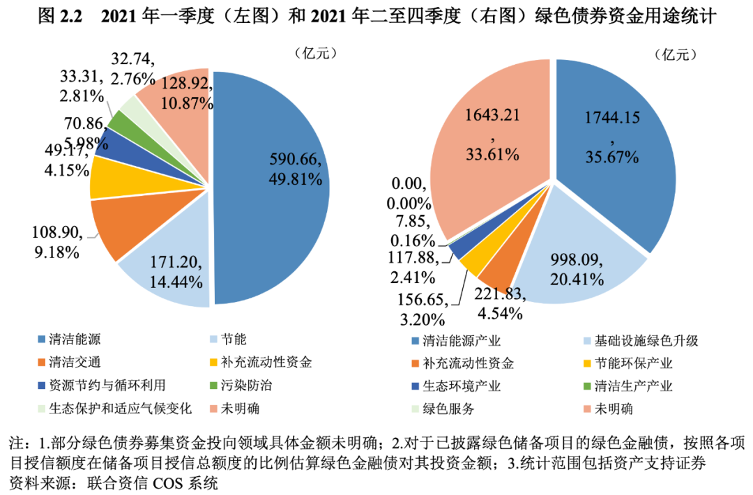 在綠色債券資金用途方面,2021年一季度,沿用《綠色債券支持項(xiàng)目目錄(2015年版)》分類進(jìn)行統(tǒng)計(jì),綠色債券募集資金主要用于清潔能源和節(jié)能領(lǐng)域,其中投向清潔能源領(lǐng)域的資金占募集資金總規(guī)模的49.81%,位列第一位;投向節(jié)能領(lǐng)域的資金占募集資金總規(guī)模的14.44%,位列第二位;投向清潔交通領(lǐng)域的募集資金占比9.18%,位列第三位。2021年二季度起使用《綠色債券支持項(xiàng)目目錄(2021年版)》進(jìn)行統(tǒng)計(jì)[7],規(guī)模前三的分別是清潔能源產(chǎn)業(yè)(占比35.67%)、基礎(chǔ)設(shè)施綠色升級產(chǎn)業(yè)(占比20.41%)、節(jié)能環(huán)保產(chǎn)業(yè)(占比4.54%)。總體來看,募集資金主要投向清潔能源領(lǐng)域,同時未明確資金投向具體領(lǐng)域的比例顯著上升。