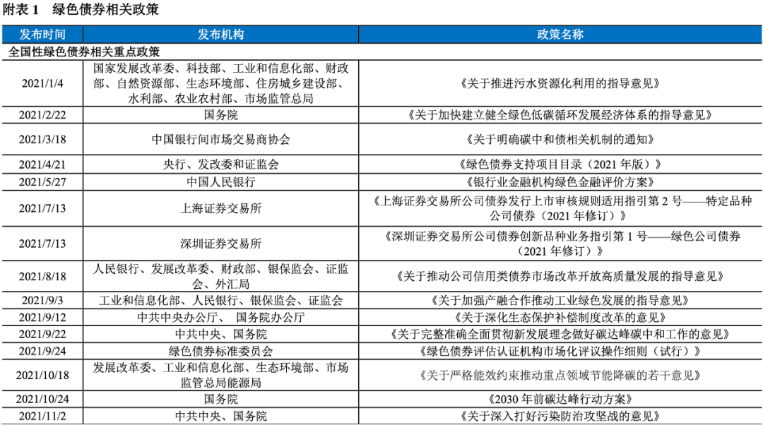 支持多領(lǐng)域綠色債券發(fā)行和擴(kuò)容。2021年1月4日,國家發(fā)改委等十部門印發(fā)《關(guān)于推進(jìn)污水資源化利用的指導(dǎo)意見》,指出鼓勵企業(yè)采用綠色債券、資產(chǎn)證券化等手段,依法合規(guī)拓寬融資渠道,推動我國污水資源化利用實(shí)現(xiàn)高質(zhì)量發(fā)展。2021年2月22日,國務(wù)院印發(fā)《關(guān)于加快建立健全綠色低碳循環(huán)發(fā)展經(jīng)濟(jì)體系的指導(dǎo)意見》,指出大力發(fā)展綠色金融,發(fā)展綠色直接融資,加大對金融機(jī)構(gòu)綠色金融業(yè)績評價考核力度。2021年7月27日,發(fā)改委等三部委發(fā)布《關(guān)于鼓勵家電生產(chǎn)企業(yè)開展回收目標(biāo)責(zé)任制行動的通知》,指出將完成回收目標(biāo)并達(dá)到國家有關(guān)管理要求的責(zé)任企業(yè)納入家電生產(chǎn)企業(yè)“綠色責(zé)任名單”,在企業(yè)發(fā)行綠色債券、綠色信貸審批時優(yōu)先支持。2021年8月18日,央行等六部委發(fā)布《關(guān)于推動公司信用類債券市場改革開放高質(zhì)量發(fā)展的指導(dǎo)意見》(以下簡稱《意見》)指出,擴(kuò)大“雙創(chuàng)”債券、綠色債券發(fā)行規(guī)模。2021年9月12日,中共中央辦公廳和國務(wù)院辦公廳印發(fā)《關(guān)于深化生態(tài)保護(hù)補(bǔ)償制度改革的意見》,指出拓展市場化融資渠道,鼓勵符合條件的非金融企業(yè)和機(jī)構(gòu)發(fā)行綠色債券。2021年9月22日,國務(wù)院發(fā)布《關(guān)于完整準(zhǔn)確全面貫徹新發(fā)展理念做好碳達(dá)峰碳中和工作的意見》,指出支持符合條件的企業(yè)上市融資和再融資用于綠色低碳項(xiàng)目建設(shè)運(yùn)營,擴(kuò)大綠色債券規(guī)模。2021年10月18日,國家發(fā)改委等四部委聯(lián)合發(fā)布《關(guān)于嚴(yán)格能效約束推動重點(diǎn)領(lǐng)域節(jié)能降碳的若干意見》,指出拓展綠色債券市場的深度和廣度,支持符合條件的節(jié)能低碳發(fā)展企業(yè)上市融資和再融資。2021年10月24日,國務(wù)院印發(fā)《2030年前碳達(dá)峰行動方案》,指出大力發(fā)展綠色債券等金融工具,拓展綠色債券市場的深度和廣度,有助于推動綠色債券市場擴(kuò)容。2021年11月2日,中共中央、國務(wù)院發(fā)布《關(guān)于深入打好污染防治攻堅(jiān)戰(zhàn)的意見》,指出大力發(fā)展綠色信貸、綠色債券、綠色基金,加快發(fā)展氣候投融資,強(qiáng)化對金融機(jī)構(gòu)的綠色金融業(yè)績評價。2021年11月10日,國務(wù)院辦公廳發(fā)布《關(guān)于鼓勵和支持社會資本參與生態(tài)保護(hù)修復(fù)的意見》,指出推動綠色基金、綠色債券、綠色信貸、綠色保險等加大對生態(tài)保護(hù)修復(fù)的投資力度;積極支持符合條件的企業(yè)發(fā)行綠色債券,用于生態(tài)保護(hù)修復(fù)工程。2021年11月27日,國資委印發(fā)《關(guān)于推進(jìn)中央企業(yè)高質(zhì)量發(fā)展做好碳達(dá)峰碳中和工作的指導(dǎo)意見》,指出積極發(fā)展綠色金融,有序推進(jìn)綠色低碳金融產(chǎn)品和服務(wù)開發(fā),拓展綠色債券的業(yè)務(wù)范圍。中央和各部委多次發(fā)文有助于拓寬不同領(lǐng)域綠色低碳企業(yè)的融資渠道,推動相關(guān)領(lǐng)域綠色債券發(fā)行。