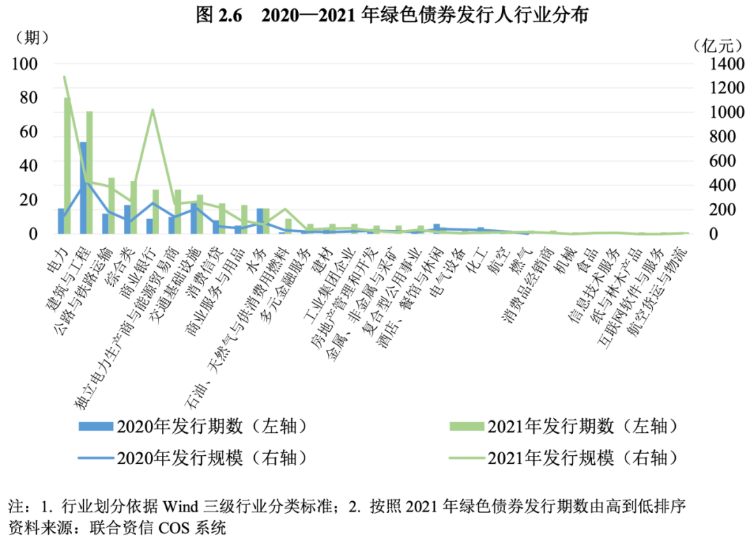 2021年,我國綠色債券發(fā)行主體共涉及電力、建筑與工程、水務(wù)等在內(nèi)的29個行業(yè),相比去年新增10個行業(yè)[10],發(fā)行主體行業(yè)分布更為廣泛。其中,電力行業(yè)企業(yè)所發(fā)綠色債券期數(shù)80期,較上年同期增長433.33%,位列第一位,發(fā)行人家數(shù)和發(fā)行規(guī)模分別為34家和1291.60億元,均較上年大幅增長;建筑與工程行業(yè)企業(yè)發(fā)行綠色債券期數(shù)72期,較上年同期增長33.33%,位列第二位,發(fā)行家數(shù)(53家)較上年同期增長26.19%,發(fā)行規(guī)模(432.86億元)較上年同期(435.60億元)略有下降;公路與鐵路運(yùn)輸行業(yè)企業(yè)發(fā)行綠色債券期數(shù)33期,較上年同期(12期)增長175.00%,位列第三位,發(fā)行家數(shù)和發(fā)行規(guī)模(12家、393.80億元)較上年同期(7家、184.00億元)顯著增長。