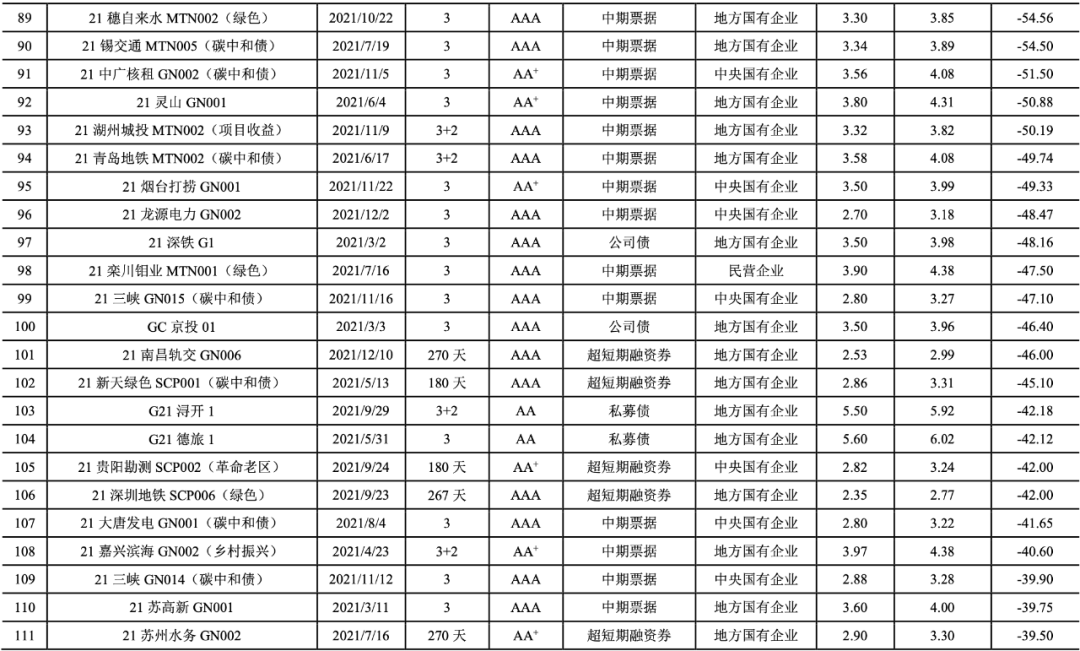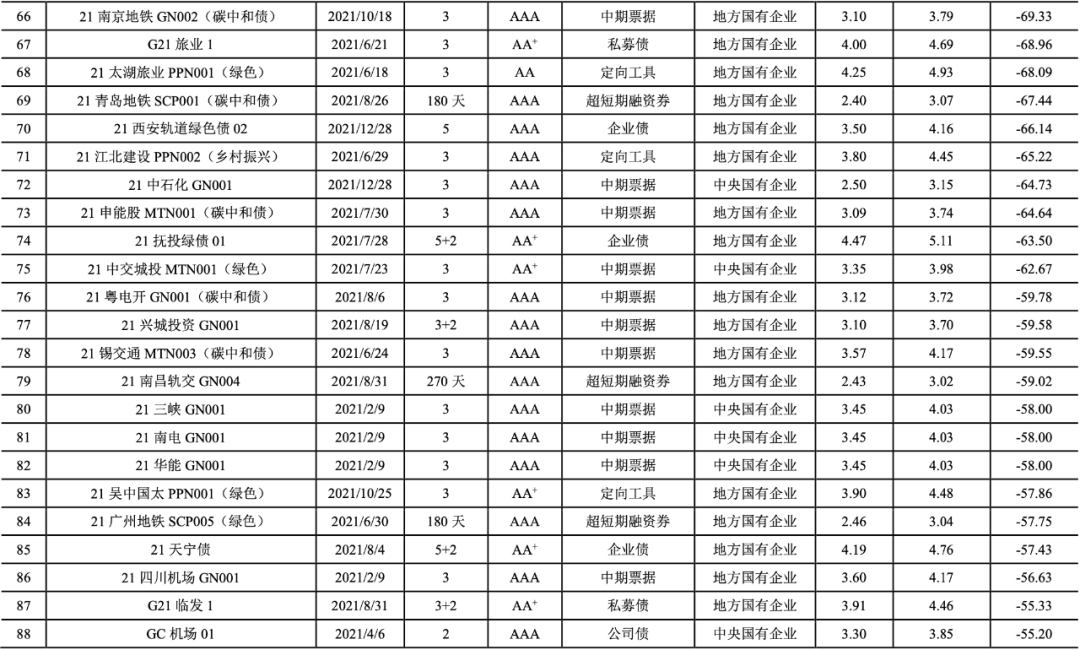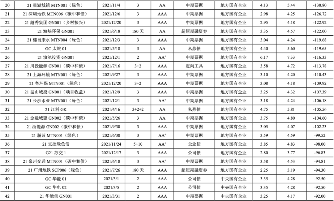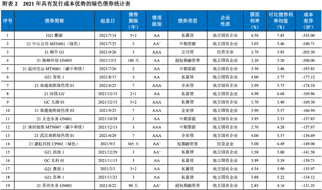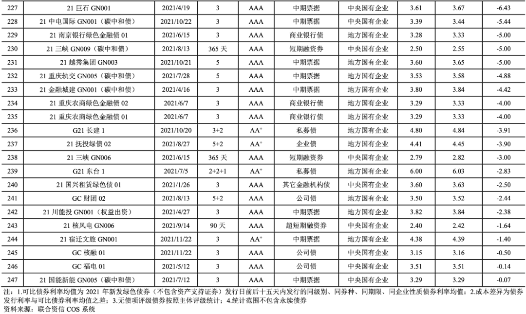 2021年,我國共有247期綠色債券的發(fā)行利率低于可比債券[14]的平均發(fā)行利率(詳見附表2),占比達(dá)到72.01%。2021年具有成本優(yōu)勢的綠色債券的加權(quán)平均息差[15]為-24.64BP。具有成本優(yōu)勢的綠色債券以國有企業(yè)(241期)為主,民營企業(yè)4期,公眾企業(yè)2期。