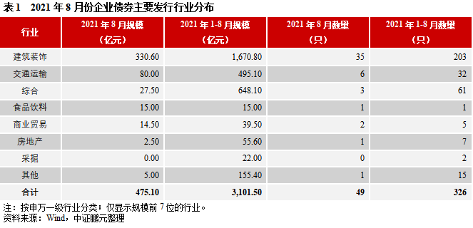 2021年8月,企業債券發行人主要分布在建筑裝飾、交通運輸等行業。其中,建筑裝飾和交通運輸行業的發行規模占比分別為69.6%和16.8%。綜合2021年1-8月份看,建筑裝飾行業發行規模1,670.80億元,占比53.9%,發行數量203只,占比62.3%,是企業債的主要發行行業,與上年同期相比,規模占比提升11.6個百分點。
