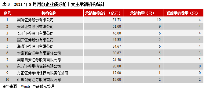 就承銷機構而言,2021年8月共有29家機構參與企業債券的承銷工作。國信證券和天風證券分別承銷51.73億元和51億元,位居第一、第二;長江證券承銷46億元,位居第三;國開證券承銷44.33億元,位居第四。