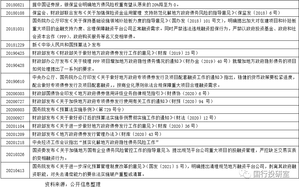 7、為緩解融資平臺到期債務違約風險,2019年6月發布的《關于防范化解融資平臺公司到期隱性債務風險的指導意見》(國辦函(2019)4號文)允許平臺公司債權人將到期債務轉讓給AMC,并提出平臺公司到期債務暫時難以償還的,允許其和金融機構協商的基礎上采取適當展期、債務重組等方式維所有隱性債務將在5-10年到期。