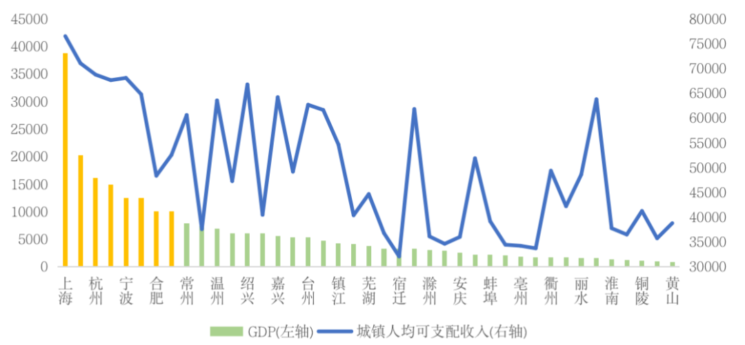 伴隨著長三角一體化上升至國家戰(zhàn)略,三省一市也迎來了更多的發(fā)展機(jī)會(huì)。受此影響,核心城市城鎮(zhèn)居民可支配收入居全國前列,購買力普遍較強(qiáng)。