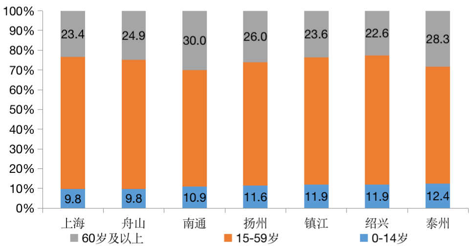 圖:長三角地區(qū)典型老齡少子化城市各年齡段人口占比(%)