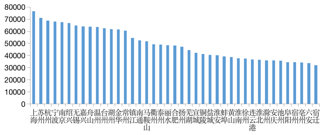 圖:長三角三省一市41城市2020年城鎮(zhèn)居民人均可支配收入(元/人)