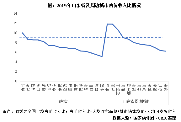 省內(nèi)城市除青島外,房價收入比均低于全國平均,居民購房壓力小。從房價收入比來看,省內(nèi)只有青島一城房價收入比達9.99,高于全國平均。其余城市房價收入比較低,居民購房壓力小。即便是省會城市濟南,購房壓力遠不及周邊省會城市南京、合肥和石家莊,甚至低于連云港這樣的三四線城市。