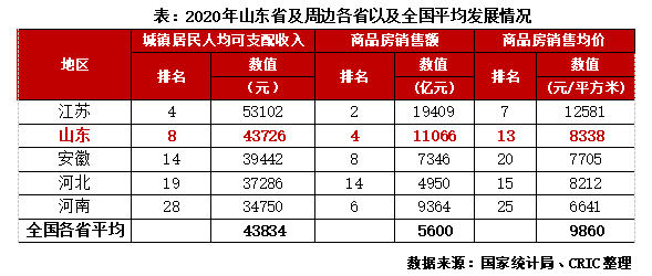 人口支撐購房需求,居民購買力催生購買意愿。山東省作為人口大省,商品房市場購房需求大,2020年全省商品房銷售總額約1.11萬億元,占全國商品房銷售額的6.4%,排名第四。城鎮(zhèn)居民人均可支配收入為43726元,略低于全國平均,但高于周邊除江蘇外的其他省份。就居民購買力來看,商品房均價可承受度高,一定程度上能加強居民購買意愿,促進房地產(chǎn)市場進一步發(fā)展。