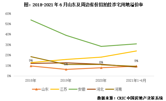 溢價率低于周邊省份,土拍市場相對平靜。據(jù)CRIC監(jiān)測,2018至2021年6月,山東省涉宅招拍掛用地的溢價率維持在6%-9%之間,與周邊省份相比,處于較為健康水平。2021年,在雙集中供地新政下,濟南和青島兩市在5月完成了首批集中供地的出讓,市場熱度較低,分別有63%和98%的土地以底價出讓,其中青島的平均溢價率僅2%。