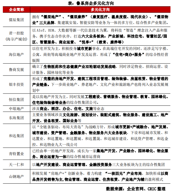 12家企業(yè)明確多元化方向,涉及范圍廣。從17家重點監(jiān)測的魯系房企來看,共有12家明確了多元戰(zhàn)略,其中多數(shù)本身為企業(yè)集團,地產(chǎn)部分只是集團多元化板塊之一。比如,除地產(chǎn)開發(fā)外,儒辰集團還擁有康養(yǎng)、物業(yè)兩大板塊,此外還有建筑安裝和智能安防等綜合業(yè)務(wù)。君一控股(海爾產(chǎn)城創(chuàng))、魯商發(fā)展、銀豐投資、恒信集團等作為企業(yè)集團,也至少擁有3個多元業(yè)務(wù)方向,值得一提的是,為完善地產(chǎn)開發(fā)上下游產(chǎn)業(yè)鏈,多數(shù)企業(yè)涉及了物業(yè)管理、裝飾設(shè)計等“地產(chǎn)+”業(yè)務(wù)。然而,也有房企涉足的部分多元業(yè)務(wù)與地產(chǎn)開發(fā)領(lǐng)域關(guān)系不大,比如魯商發(fā)展涉及化妝品和藥品生產(chǎn)銷售、恒信集團發(fā)展教育業(yè)務(wù)、和達集團把資產(chǎn)管理和金融服務(wù)納入主要業(yè)務(wù)板塊。