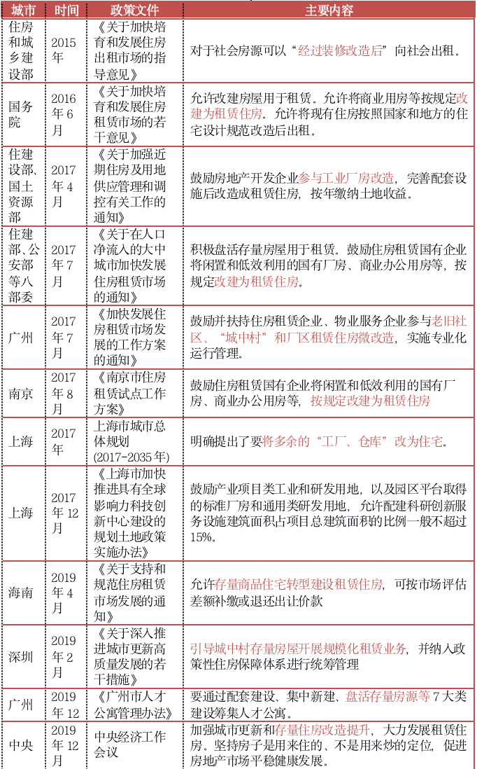 在中央的引領(lǐng)下,多個試點城市如上海、深圳、南京等發(fā)布方案細則,推動“工改租”、“商改租”、“非改居”等改造模式,進而促進存量資產(chǎn)與租住需求的有效對接,整合資源,緩解城市住房矛盾。