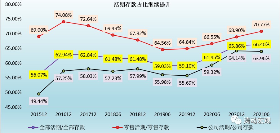 2019年以來招行提升了對活期存款的重視程度。今年上半年招行的活期存款繼續保持穩定增長,其中零售活期存款與公司活期存款分別較2020年底增長8.37%和6.37%。截至2021年6月,招行零售存款與公司存款中,活期存款占比分別達到70.77%和63.96%,全部活期存款占比亦達到66.40%,較2020年底提升了0.54個百分點(零售活期存款占比提升1.87個百分點),應該說這一占比在國內銀行中基本上已經處于國內銀行業非常高的位置。