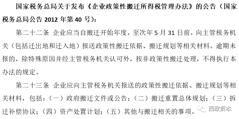 2. 政策性搬遷所涉遞延納稅的優惠政策須以申報、備案為前提,如被拆遷企業未及時申報、備案,則不能自然享受遞延納稅的優惠政策,也即遞延納稅事宜如未及時申報、報備或未及時完稅,則面臨滯納金、罰金等繳納風險。