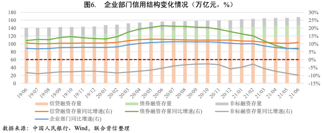 企業(yè)部門信用結(jié)構(gòu)進(jìn)一步分化。在上年同期高基數(shù)影響下,截至2021年6月末,企業(yè)部門信貸融資、債券融資以及非標(biāo)融資存量同比增速均有所下降。信貸融資基本保持平穩(wěn)增長(zhǎng),同比增速小幅下降1.58個(gè)百分點(diǎn)至10.78%。2021年上半年非金融企業(yè)部門新增人民幣貸款8.37萬億元,為僅次于上年同期的歷史較高值。從結(jié)構(gòu)來看,中長(zhǎng)期貸款仍是主導(dǎo)地位,新增6.62萬億元,創(chuàng)歷史新高,反映出企業(yè)資本開支需求旺盛;新增短期貸款與票據(jù)融資同比少增,反映出企業(yè)流動(dòng)性管理訴求趨于正常。債券融資下降明顯,同比增速大幅下降10.98個(gè)百分點(diǎn)至6.72%。上半年新增債券融資規(guī)模不及上年同期的一半,除上年高基數(shù)影響之外,上半年企業(yè)債券發(fā)行利率較上年同期顯著升高、4月底出臺(tái)政策加強(qiáng)公司債信息披露要求和限制發(fā)行規(guī)模以及募集用途等因素可能也對(duì)企業(yè)發(fā)債產(chǎn)生一定抑制作用。非標(biāo)融資持續(xù)壓降,同比增速進(jìn)一步下降3.96個(gè)百分點(diǎn)至-9.84%。上半年非標(biāo)融資規(guī)模收縮8437億元,同比多減8698億元。