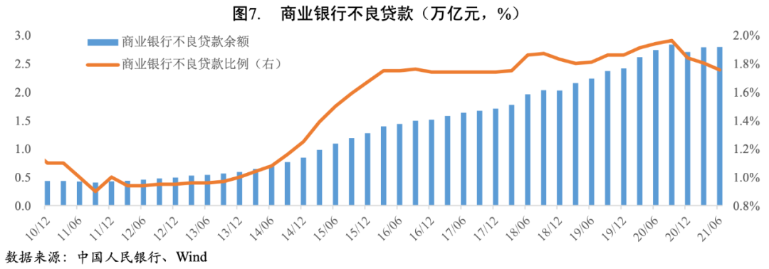 截至2021年6月末,我國(guó)商業(yè)銀行不良貸款余額2.79萬億元,較上年末增加892.78億元;商業(yè)銀行不良貸款率1.76%,較上年末下降0.08個(gè)百分點(diǎn),主要是國(guó)內(nèi)經(jīng)濟(jì)延續(xù)良好復(fù)蘇態(tài)勢(shì),疊加監(jiān)管部門引導(dǎo)金融機(jī)構(gòu)強(qiáng)化風(fēng)險(xiǎn)防范、加大不良處置力度,使得商業(yè)銀行信貸資產(chǎn)質(zhì)量保持穩(wěn)定。此外,去年為對(duì)沖疫情影響出臺(tái)的普惠小微企業(yè)貸款延期還本付息政策和信用貸款支持政策,進(jìn)一步延長(zhǎng)至2021年底,有利于穩(wěn)定企業(yè)現(xiàn)金流,緩釋流動(dòng)性風(fēng)險(xiǎn),對(duì)商業(yè)銀行不良貸款率的穩(wěn)定具有積極效果。