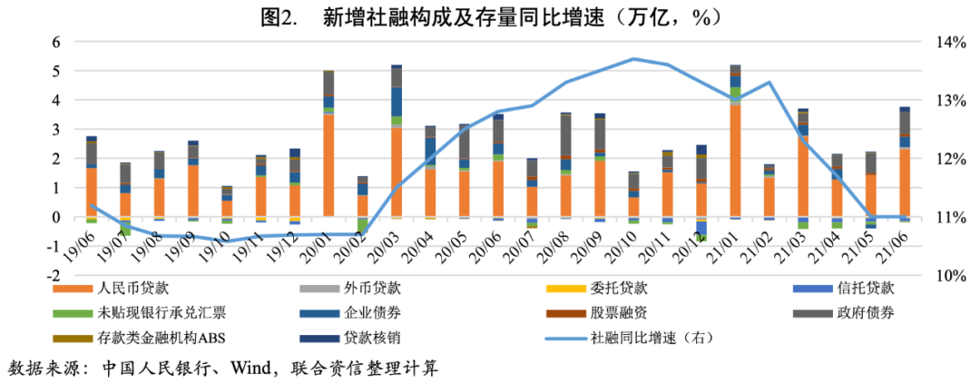 2021年上半年,社融存量同比增速整體呈下行趨勢(shì)。截至6月末,社會(huì)融資規(guī)模存量達(dá)到301.56萬億元,同比增速較上年末下降2.30個(gè)百分點(diǎn)至11.00%。上半年新增社融17.74萬億元,雖同比少增3.09萬億元,但卻是僅次于上年的歷史同期較高值,反映出上半年實(shí)體經(jīng)濟(jì)融資需求較為旺盛。