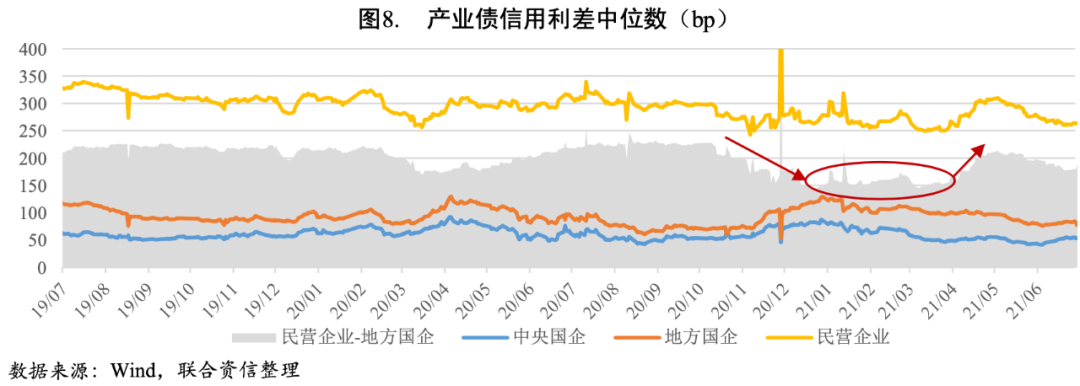 2021年上半年,債券市場(chǎng)新增違約主體18家,到期違約金額合計(jì)約778.97億元,較上年同期有所上升,債券市場(chǎng)信用風(fēng)險(xiǎn)繼續(xù)釋放。從信用利差來看,在上年四季度連續(xù)發(fā)生大型國(guó)企的違約事件后,地方國(guó)企的產(chǎn)業(yè)債信用利差迅速走高,與民營(yíng)企業(yè)產(chǎn)業(yè)債信用利差之差(圖8中灰色部分)縮窄近80bp,今年一季度仍保持在較低的150bp左右,與一季度國(guó)企違約事件頻發(fā)[4]相印證,高杠桿、弱資質(zhì)國(guó)企信用風(fēng)險(xiǎn)繼續(xù)暴露;二季度國(guó)、民企利差出現(xiàn)分化,民營(yíng)企業(yè)信用利差上行,地方國(guó)企信用利差呈下行趨勢(shì),反映出二季度民企違約數(shù)量有所增加,信用風(fēng)險(xiǎn)上升,市場(chǎng)對(duì)地方國(guó)企的擔(dān)憂情緒有所緩和。