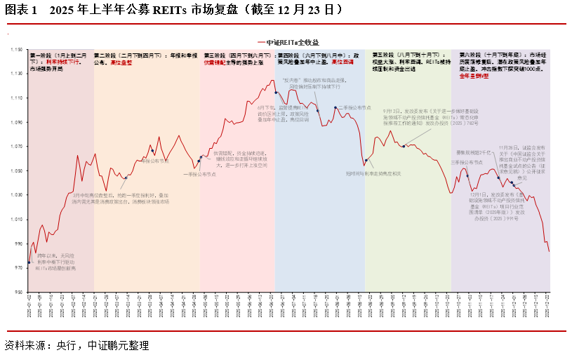 2025年我國公募REITs市場走勢呈現(xiàn)倒V型,先漲后跌,指數(shù)年內(nèi)最高漲幅達16%,臨近12月底,累計跌幅回調(diào)至2%左右。截至12月23日,2025年中證REITs全收益指數(shù)報收983.81點,年內(nèi)漲幅回調(diào)到1.65%,下半年市場的持續(xù)下跌拖累REITs在大類資產(chǎn)漲跌幅排名中表現(xiàn)靠后。從板塊來看,消費基礎(chǔ)設(shè)施REITs領(lǐng)漲市場,除了個別項目與年初持平,其余年內(nèi)漲幅達18%-40%。市場持續(xù)擴容,全年共新發(fā)行REITs產(chǎn)品22只,其中首發(fā)20只,發(fā)行規(guī)模為407.81億元,同時2單擴募項目,華夏北京保障房REIT擴募規(guī)模為9.46億,國泰海通臨港創(chuàng)新產(chǎn)業(yè)園REIT擴募規(guī)模為17.23億。流動性方面,市場活躍度顯著增強,2025年全市場日均成交額達5.9億元,較2024年同期的4.21億元大幅提升40%。2025年以來我國公募REITs二級市場走勢可以分為六個階段: