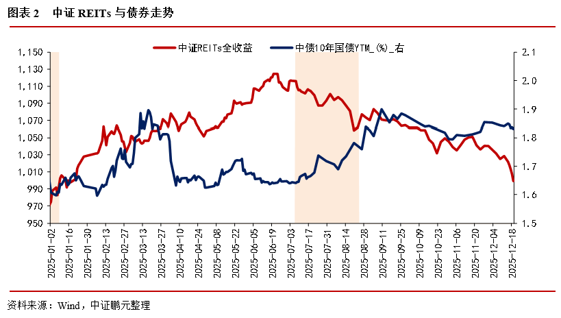 2025年我國公募REITs走勢可以分為六個階段:第一階段是從一月初到二月末,市場強勢開局,無風(fēng)險利率中樞持續(xù)下行,REITs的高分紅優(yōu)勢凸顯。第二階段是從二月末到四月末,REITs市場呈現(xiàn)高位盤整格局。第三階段是從四月末到六月下旬,市場進入供需錯配主導(dǎo)的強勢上漲階段。這一階段的行情主要由資金驅(qū)動,與股債市場表現(xiàn)相關(guān)性差,形成獨立分化走勢,機構(gòu)投資者普遍處于欠配狀態(tài),倉位回補需求與持續(xù)涌入的前期踏空資金共同推動市場上行。第四階段是六月下旬到八月中旬,市場開啟下半年下跌行情,呈現(xiàn)高位回調(diào)態(tài)勢。監(jiān)管窗口指導(dǎo)詢價區(qū)間上下限提高,推高新發(fā)REITs的定價水平,對市場情緒形成壓制,疊加估值偏高和止盈,市場普遍回調(diào)。第五階段是八月下旬到十月下旬,市場經(jīng)歷短暫回調(diào)后進一步突破下行。這一階段,REITs市場與債券相關(guān)性有所鈍化,隨著權(quán)益市場進入震蕩階段,市場風(fēng)險偏好降溫,REITs市場吸引部分資金回流,后續(xù)權(quán)益市場再度大漲,利率回調(diào),REITs被持續(xù)壓制和資金出逃,再次進入陰跌模式。第六階段是十月下旬至十二月下旬,市場在盤整后進入持續(xù)下行通道,指數(shù)一度跌破1000點整數(shù)關(guān)口。12月之后,經(jīng)營權(quán)本息拆分預(yù)期升溫,疊加年底機構(gòu)止盈需求,雙重壓力下市場進入快速下跌階段,12月10日起,市場經(jīng)歷10連跌,指數(shù)一度跌破1000點。