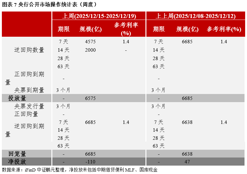 上周(2025/12/15-2025/12/19)流動性相對平穩(wěn),回購利率漲跌互現(xiàn)。具體來看,隔夜利率較前一周上行0.44BP至1.35%,7天回購利率上行0.73BP至1.51%。中等期限方面,14天回購利率上行6.91BP至1.62%,21天回購利率上行16.06BP至1.72%,1個月回購利率下行0.62BP至1.69%。