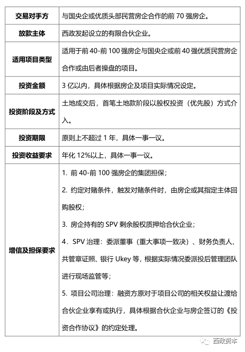(2)投資前提條件:融資方最好為前40-前100強房企,適用于該前100強房企與國央企或經(jīng)認可的前40強優(yōu)質(zhì)民營房企合作開發(fā)類項目;合伙企業(yè)在項目交完土地保證金后介入,其中前融資金可根據(jù)項目實際情況與開發(fā)貸并存;融資方原對于項目公司的相關(guān)權(quán)益讓渡給合伙企業(yè)享有或執(zhí)行,具體根據(jù)合伙企業(yè)與房企簽訂的《投資合作協(xié)議》的約定處理。