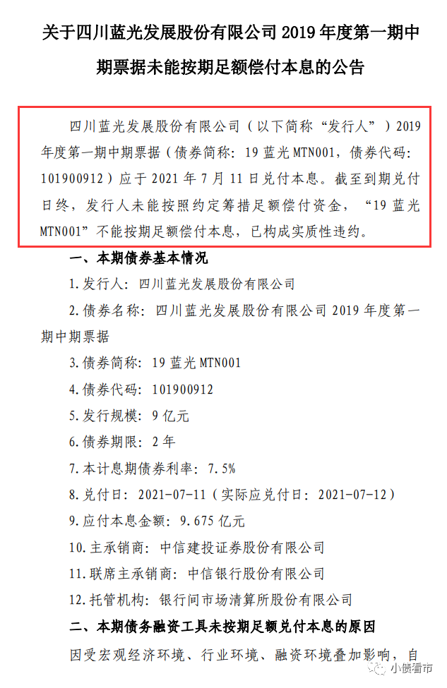 此前7月8日,藍光發展已公告稱由于公司流動資金不足,“19藍光MTN001”本息兌付存在不確定性。