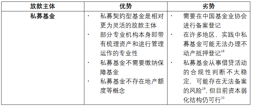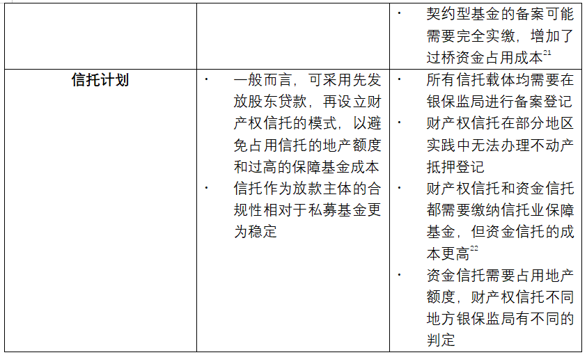 目前類REITs的放款主體,大致可以設私募基金、信托計劃兩種類型。我們列表分別講講優勢和劣勢: