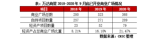 疫情不改趨勢,2020年開業45座目標順利完成,2021年開始進入全面輕資產化模式。盡管疫情影響,但是通過“模塊化管理”等高科技手段,2020年全年萬達順利完成開業45家萬達廣場的營運目標,截止至2020年底萬達共在全國開業了368座廣場,數量居于全國第一。與此同時,企業的輕資產化戰略也有序推進,2020年9月,萬達商管正式對外宣布從2021年開始,不再發展“重資產”,全面實施“輕資產”戰略,即企業不出萬達廣場的資金也不再持有,只輸出品牌,負責設計、建設與運營,并分得收益。根據企業公布信息,2020年開業廣場中27座為輕資產模式,占比達到60%,當年新簽約60個輕資產萬達廣場,是2019年的167%。截止到2020年底,在建的142個萬達廣場中,輕資產占比超過80%,2021年企業計劃更進一步,以簽約70座輕資產萬達廣場為目標。