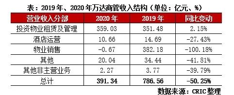 全面轉型完成,投資物業租賃管理收入維持增長,凈利潤率突破35%。2020年萬達商管實現營業收入391.34億元,同比下降50.25%。收入的下降主要是兩方面因素影響,其中最主要的原因是2020年萬達商管全面剝離住宅物業開發業務,轉型商業運營及管理公司。從收入結構來看非常明顯,2020年企業物業銷售收入為-0.67億元,而上年該分部業務收入為382.18億元。另外由于疫情原因,企業減免了43.3億元的租金,酒店等業務也受到不同程度的影響,收入有所下滑。不過值得關注的是盡管減免了超過40億租金,2020年企業的投資物業租賃及管理收入仍然維持了正向增長勢頭,業務韌性強勁。另外由于企業已無利潤率相對較低的物業銷售收入入賬,收入主要由盈利較強的投資物業租賃及管理業務貢獻,2021年集團凈利率再上臺階,全年凈利率高達35.34%。