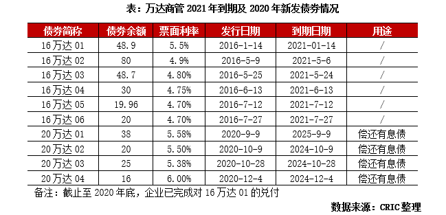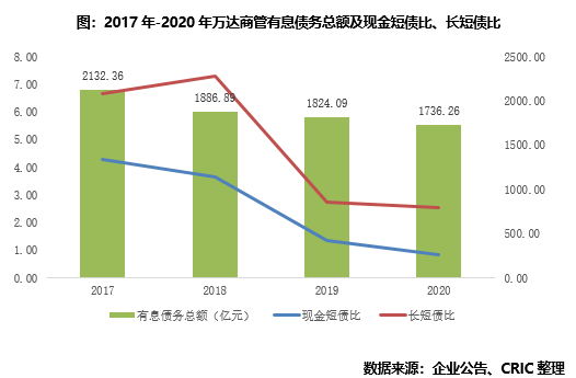 21年中旬步入償債高峰期,企業正借新還舊紓解債務壓力。根據企業2020年中期披露的報告,2021年將會有247.56億元的債券集中到期,主要集中在2021年的5-7月。面對集中兌付的資金壓力,企業在2020年下半年開始提前發行四筆債券,合計融資額99億元,全部用作償還有息債務,以對沖到期債務高峰期,融資利率方面均在6%以下,相較于2020年典型房企6.07%的平均融資利率也有優勢。根據2020年報告公布的債券余額情況,截止至年底,16萬達01已完成兌付。另外根據CRIC監測,“大連萬達商業管理集團股份有限公司公開發行2021年公司債券”已經被上交所成功受理,總規模達到128億元,若能成功獲準發行,企業新發行債務基本可對沖到期債券總額,短期債務壓力得到有效緩解。